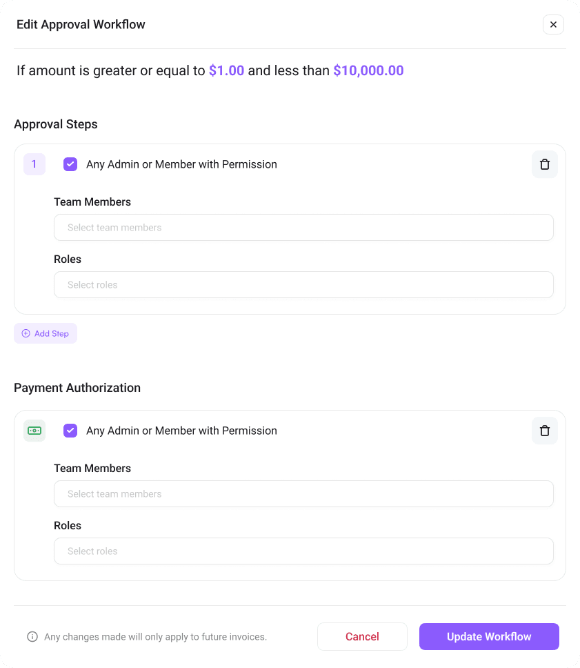 Empower your team to process invoices and onboard the vendors they manage, while giving finance and leadership full oversight across the organization. Set up multi-step approvals, delegate by department or spend threshold, and ensure nothing gets paid without the right sign-off.